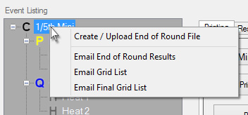 Emailing 'End Of Round' and 'Grid Lists' can be performed by right clicking on the Category name (as shown in the screen shot below), and then clicking the required email menu item.